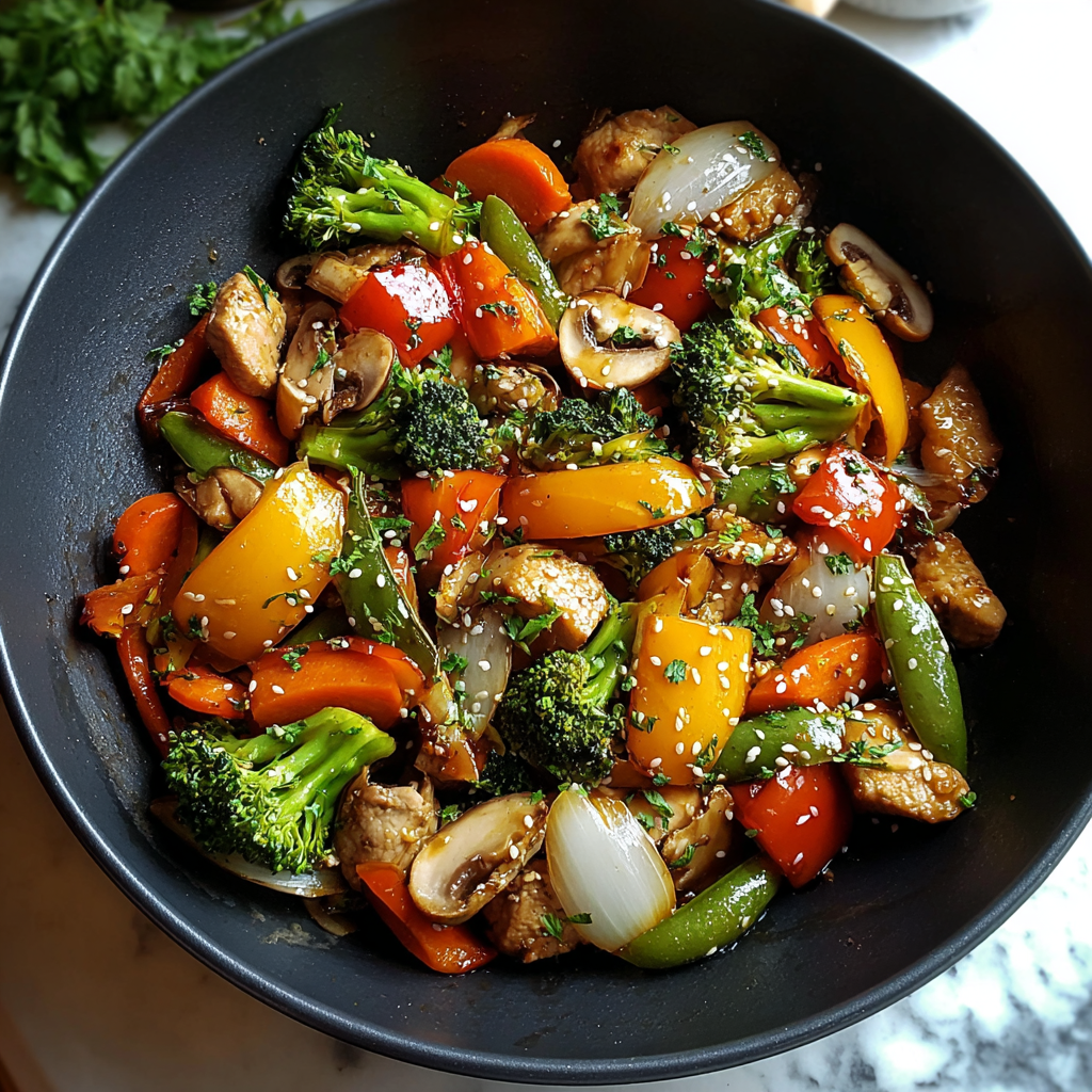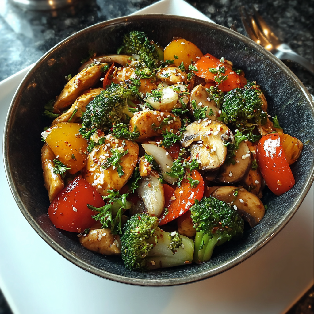 - Prepare the Ingredients: Wash and slice all vegetables (bell peppers, onion, mushrooms, snap peas, and broccoli). Dice the chicken breast into bite-sized pieces. Mince the garlic and ginger.